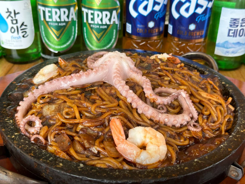 대망의 돌짜장은 비쥬얼이 미쳤습니다 진짜. 돌짜장 위에 낙지 한마리가 올라와져있는데 이야 이게 도대체 무슨 조합일까 하는 생각이 들었어요.