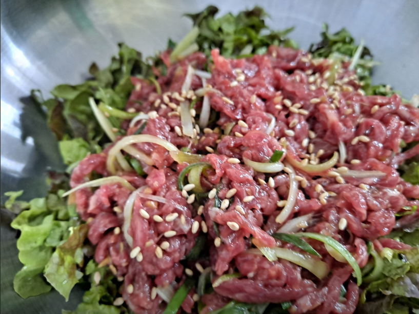 예약을 하고 가면 기본 상차림도 빨리 나와서 더욱 좋답니다. 야채들은 모두 싱싱하고, 특히 고추다대기 반찬이 매력적이에요. 어릴 적부터 좋아했던 이 반찬은 거창의 식당에서 만나면 더욱 반가워요. 소고기와 함께 먹거나 밥에 비벼 먹으면 정말 맛있답니다. 이곳의 백미는 바로 육사시미예요. 신선한 명품 한우를 그대로 맛볼 수 있답니다.