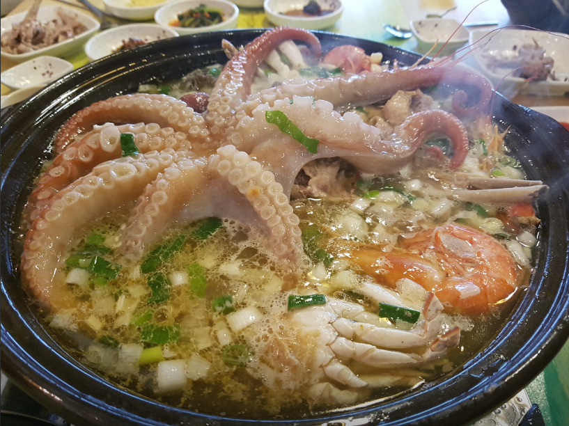 활문어와 활전복, 새우와 꽃게가 들어가는 완전 보양식 백숙인데요, 맛이 자극적이지 않고 각종 해산물이 들어가서 국물이 우러나오니까 맛이 개운하고 깔끔해서 먹는 동안에도 몸에 열이 풀풀나서 땀이 줄줄 흘렀어요.