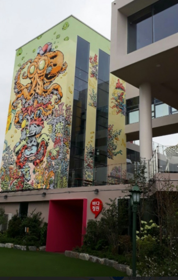 여기 바다정원은 카페&베이커리 집인데요, 건물 외관이 특이하고 멋져요. 5층짜리 건물로 신관 1층은 카페&베이커리 주문 및 픽업을 할 수 있고 실내 테이블과 야외 테라스 정원/솔밭/원두막 등 여러 테마로 꾸며진 휴식 공산들이 있답니다.
