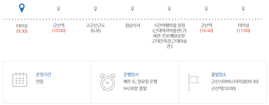 탑승장소 : 군산 시외버스터미널 앞(09:30 출발) / 군산역(10:00 출발)