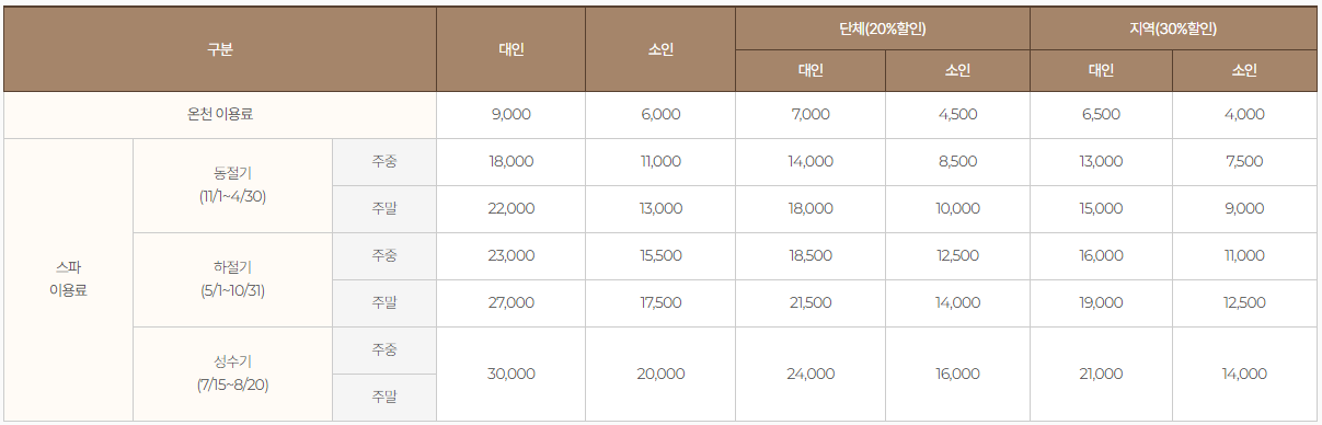 이곳은 매월 셋째 주 월요일에 휴무이며, 온천과 스파 서비스가 분리되어 요금이 책정되어 있어요. 스파 이용료는 계절과 성수기에 따라 변동됩니다. 성수기는 7월 15일부터 8월 20일까지에요.