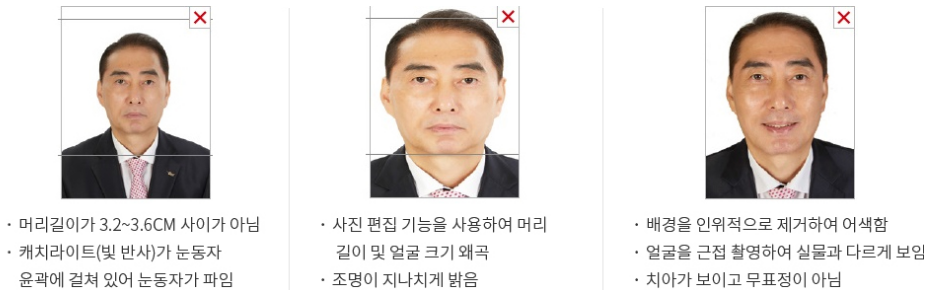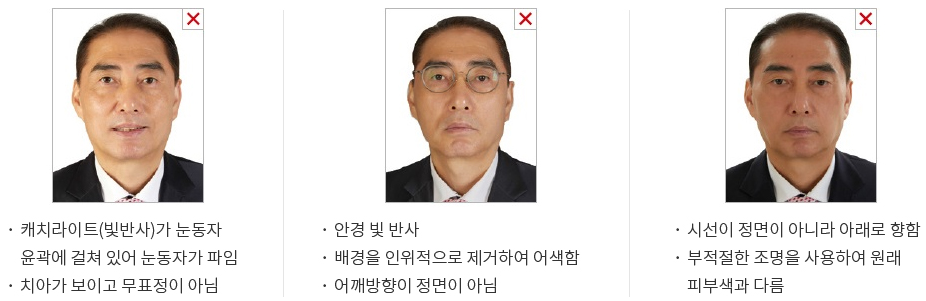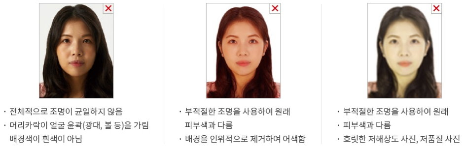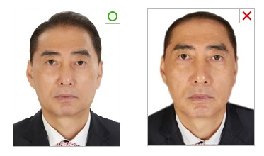 - 머리카락으로 눈을 가려서는 안되며, 얼굴 전체(이마~턱, 얼굴 윤곽 등)가 완전히 노출되어야 합니다.