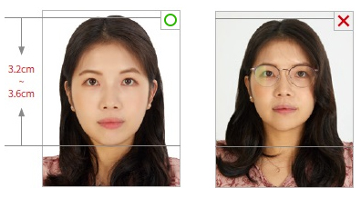 - 여권사진의 크기는 가로 3.5cm X 세로 4.5cm, 머리 길이는 정수리(머리카락을 제외한 머리 최상부)부터 턱까지 3.2~3.6cm 사이인 사진을 제출해야 합니다.