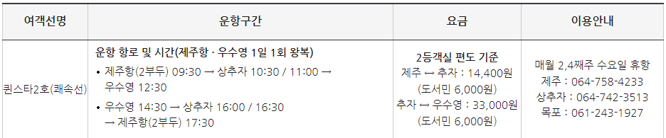 - 제주 ↔ 추자: 14,400원 (도서민 6,000원)
