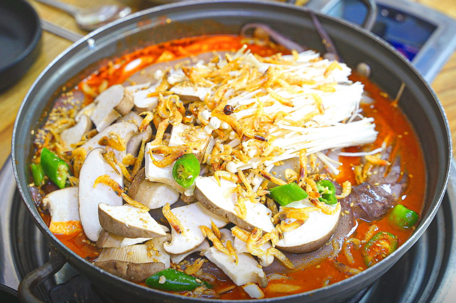 터줏골명가는 짜글이 맛집인데요, 도톰한 돼지고기와 두부, 각종 버섯과, 파채, 김치를 자글 자글 끓이면 국물맛이 진짜 기가 막힙니다. 매콤하고 칼칼하니 밥 도둑이기도 하지만 소주 한잔하기에도 굉장히 좋아요.
