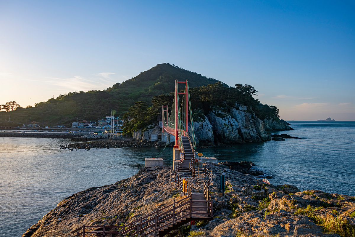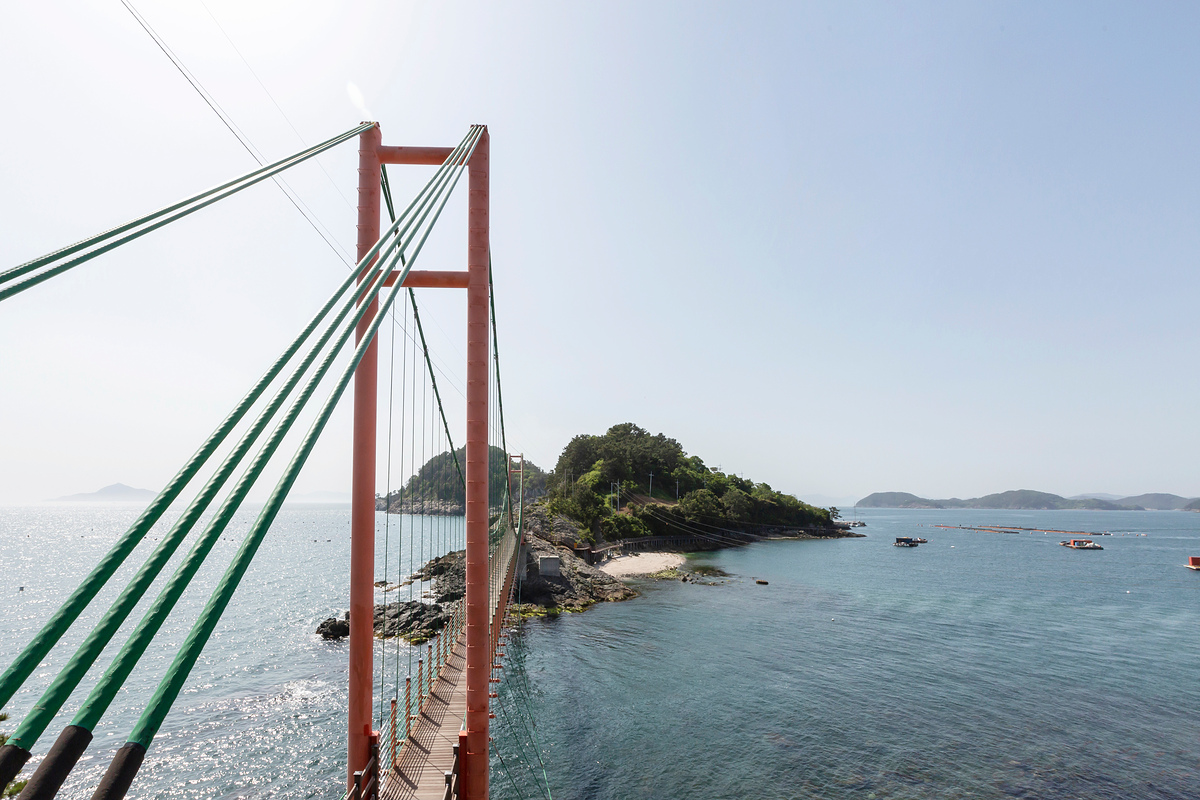 버스에서 내려 출렁다리 입구로 걸어갔을 때, 동두항과 동두마을이 보이는 전망이 정말 멋졌어요. 출렁다리는 총 길이 44m, 폭 1.5m로 KBS 드라마 '연애의 발견' 촬영지로도 유명해졌어요. 출렁다리 위에서 바라본 기암괴석의 풍경은 정말 잊을 수 없을 정도로 멋졌죠. 전망대 안내 표지판을 따라 바위로 된 길과 숲속 길을 걸어 전망대에 도착했어요. 여기에서는 욕지도와 통영 8경으로 유명한 용머리 해안의 경치를 볼 수 있었어요.
